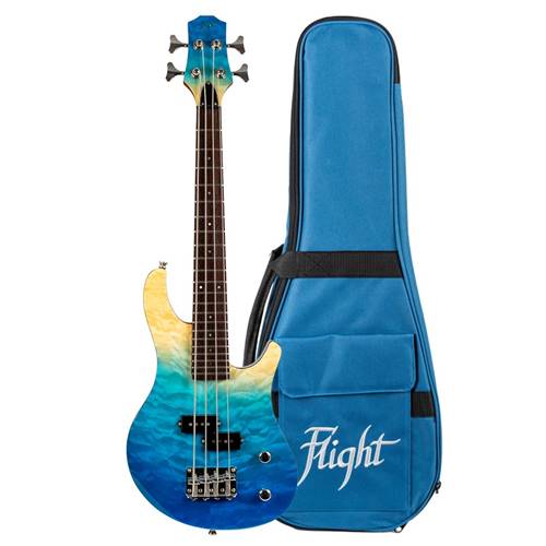 The Mini Bass is Flight’s second bass ukulele, its first with a solid body and metal strings. This incredible instrument features standard bass tuning (EADG) in a smaller 510mm/20”scale that is perfect for gigging and traveling bass players. With a gradient blue finish on a quilted maple top, modern styled body, roasted maple neck, and rosewood fretboard, the instrument has been created to look awesome and be comfortable to play.