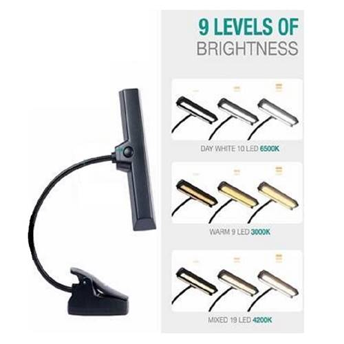 This LED stand or piano light is rechargeable with the provided USB cable (no batteries needed). Wide illumination area, Anti-Glare Shield Design, approx. 60 hours per charge, lightweight and flexible for different applications.