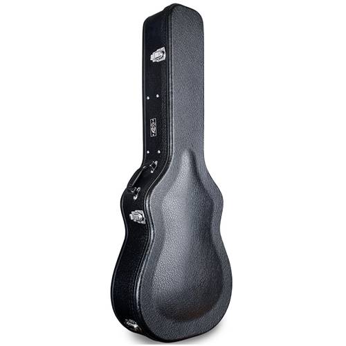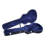 As found paired with current Guild USA models – may also fit historic models of similar size and shape. Features a built-in Humicase humidifier, arched lid, nickel Guild G-shield badge, durable black vinyl exterior covering, nitrocellulose-friendly green crushed-velvet interior lining, padded handle, chrome hardware with locking latch, and inner accessory compartment.