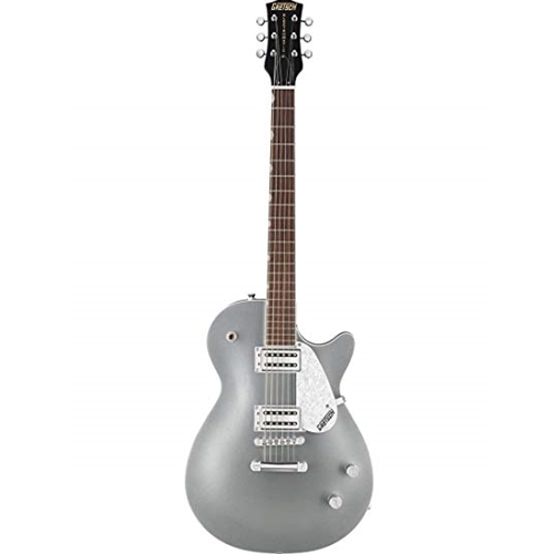 The G5425 Jet Club has a single-cutaway chambered basswood body with an arched maple top that resonates true to "That Great Gretsch Sound™," with a two-tone body color scheme (Black or Silver top with Walnut-stained back and sides). Features include Gretsch dual-coil humbucking pickups that ensure luscious tone, 22 medium jumbo frets, anchored Adjusto-Matic™ bridge and stop tailpiece that ensure vibrant sustain, Neo-Classic™ thumbnail fingerboard inlays, G-arrow knobs and white pearloid Gretsch-logo pickguard.
