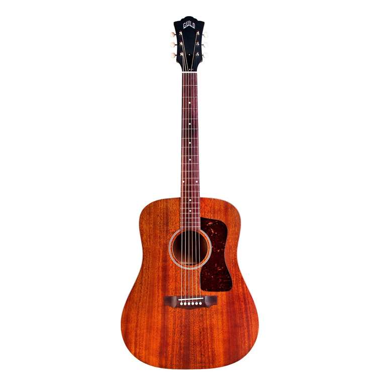 The D-20, is a dreadnought acoustic guitar built with solid mahogany top, back, and sides. First introduced to the Guild line in 1968, this model features a rosewood bridge and fingerboard, bone nut and saddle, and an extremely light satin finish that allows this guitar to truly sing. The D-20’s modest appointments include a vintage style rosette and Guild’s peak logo inlaid in mother-of-pearl on the headstock. Each D-20 comes with a hand-signed, numbered certificate of authenticity, and ships with a hardshell case. Available in Natural, Vintage Sunburst, Natural with LR Baggs pickup (D-20E Nat), and Sunburst with LR Baggs pickup (D-20E VSB). Solid African Mahogany top construction with Solid African Mahogany back and sides.