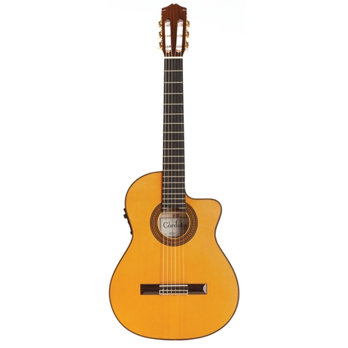 The handcrafted 55FCE's thin, feedback-resistant body makes this Spanish-made guitar an essential tool in the gigging musician's arsenal. The chosen guitar of the Gipsy Kings, its solid Eropean spruce top is paired with stunning flamed maple back and sides and honey amber tinted or natural polyurethane finish.