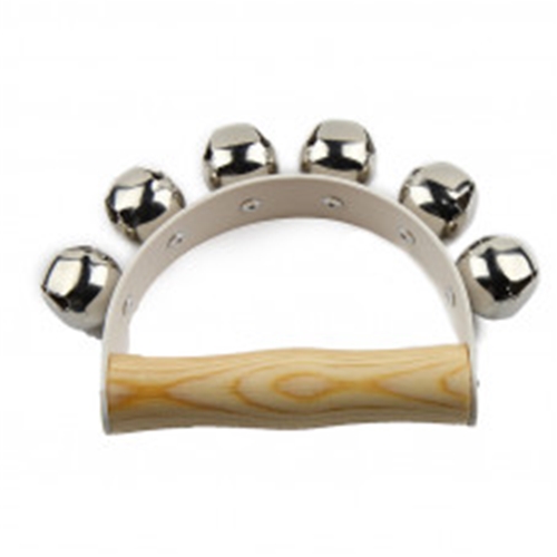 Five extra large bells, resonant sound, mounted on vinyl strap, wooden handle. (15cm x 13cm) maximum.
