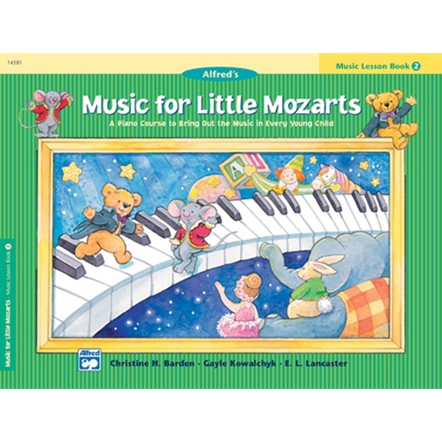Lesson Book 2 starts as pre-reading, then moves to reading on the staff. After a review, the new concepts taught are: Dotted quarter note and 4/4 time, 4/4 time, Mezzo-forte, Staff and note reading, Steps and skips, Grand staff. New notes taught are F and G in the LH and RH, completing the Middle C position.