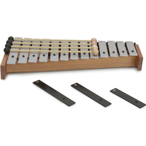 Suzuki glockenspiels are mounted on selected hardwood resonator boxes. The bars are made of durable aluminum alloy. The Alto glockenspiel is pitched the same as the Soprano metallophone but has a lighter sound. Complete with two pairs of double-headed mallets. (43.5cm x 19.9cm x 6.1cm). C5-A6, 1 Bb, 2 F#s, 2 pairs mallets.