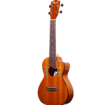 The Solid Acacia line bears curling that is similar to its close relative Koa. The Acacia’s resemblance to its cousin is apparent in its beautiful, varied grain pattern. The all solid wood allows the sound to improve as it is broken in.